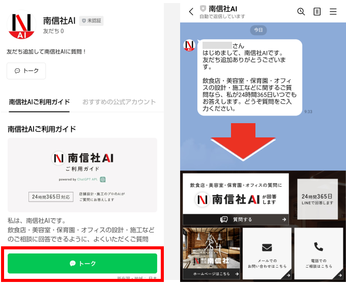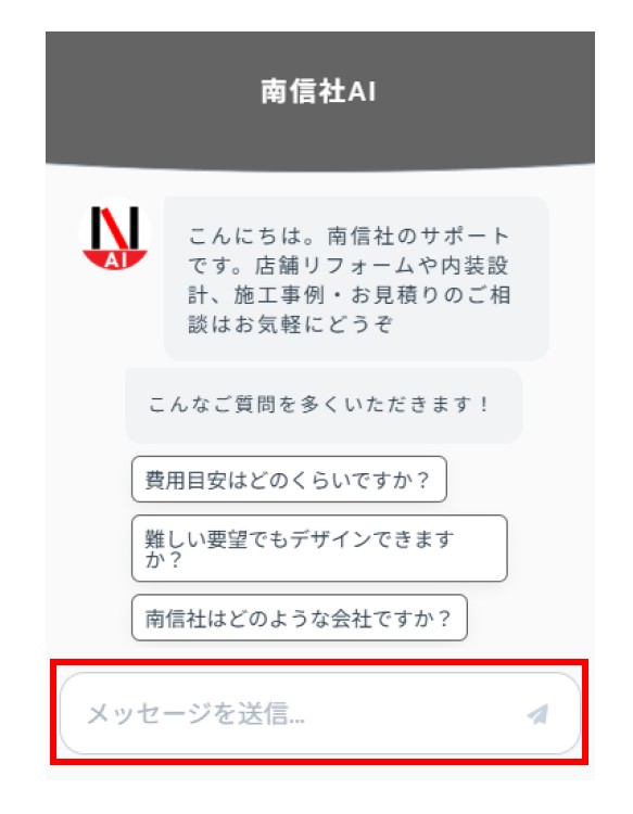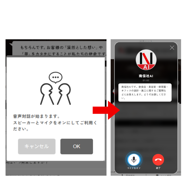 AIとの音声対話でも、飲食店・美容室・保育園・オフィスの設計・施工などの質問や相談ができます。 南信社AIと、気軽に電話のような感覚で対話をしてお悩み解決ができます。