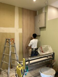 下地が整ったら、いよいよクロスを貼り付けます。専用の糊付け機で均一に糊を塗布したクロスを、空気が入らないように専用のヘラで外側へ逃がしながら貼り進めます。柄物や木目調などのクロスは、隣り合うシートとの「柄合わせ」に高度な技術を要します。また、つなぎ目が目立たないよう、0.1ミリ単位の精度で裁断と圧着を行います。