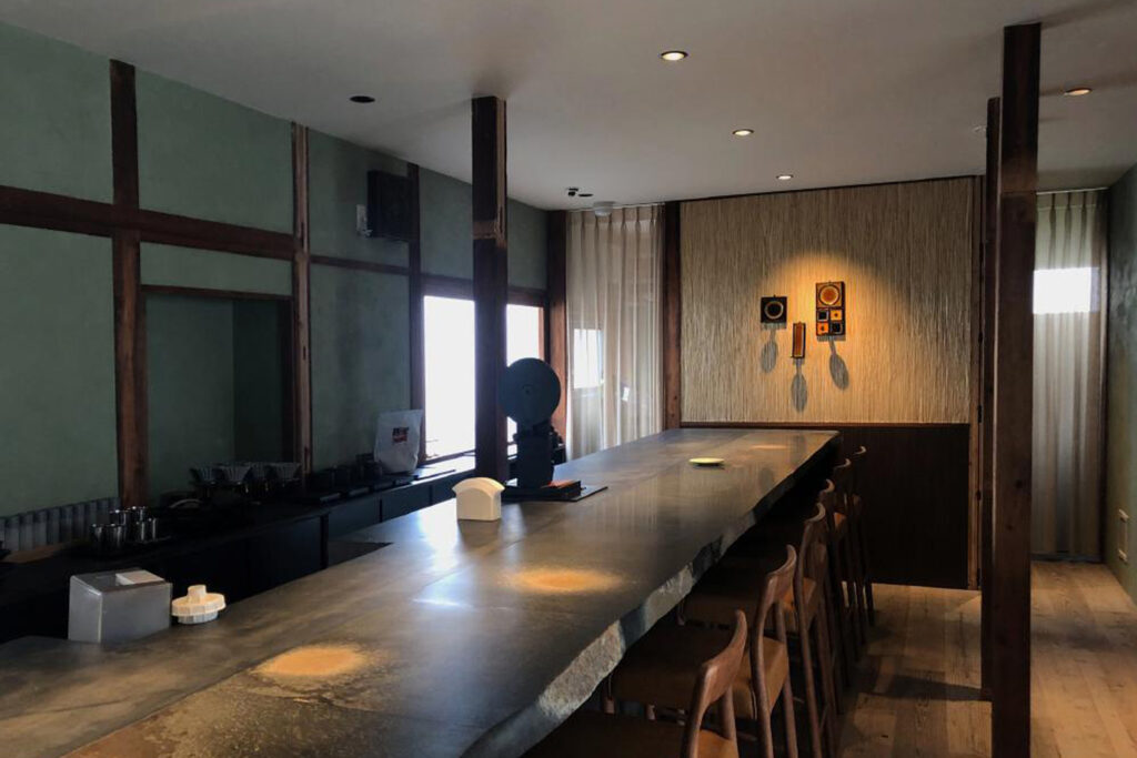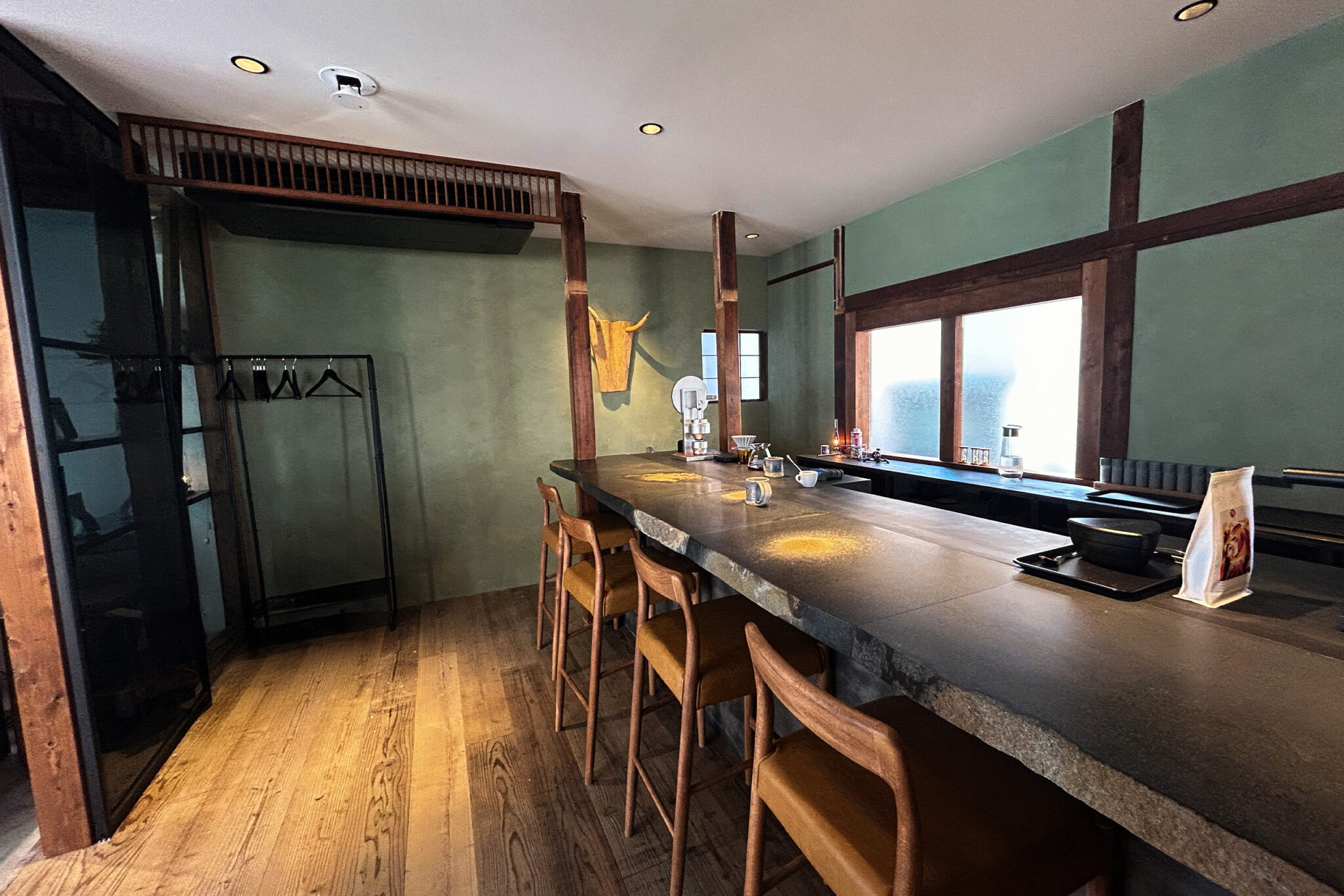 古民家の古材が醸し出す温もりに、中央カウンターの伊達冠石が重厚な存在感を添え、壁面のモダンな色使いが空間にほどよい緊張感を与えています。