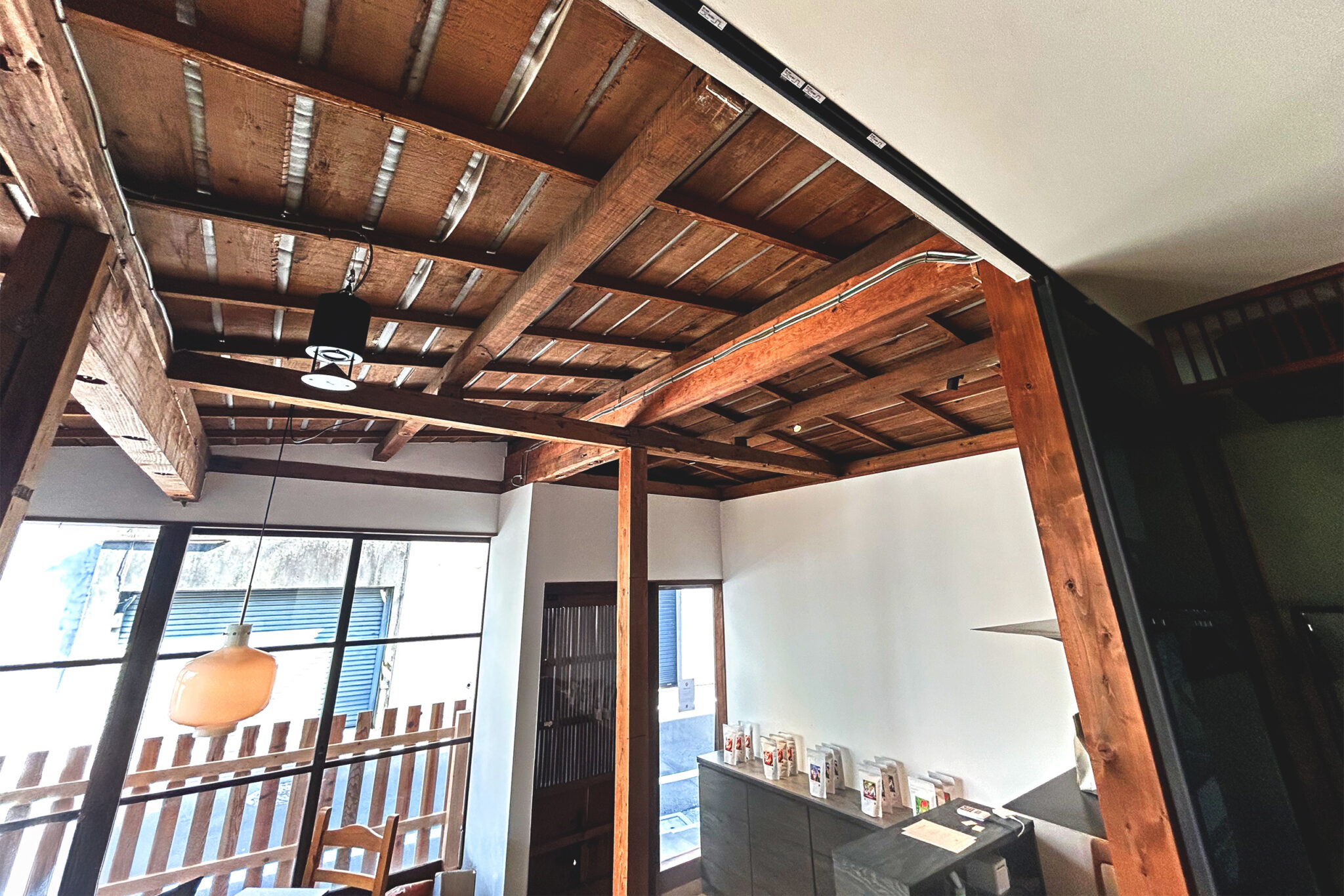 構造体を敢えて見せるため、柱の増設や梁の入れ替えといった補強を実施。また、古民家の床上でも重量のあるカウンター天板を安全に乗せるため、腰壁の骨組みにはコンクリート基礎、鉄骨下地を組んで強度を確保しております。