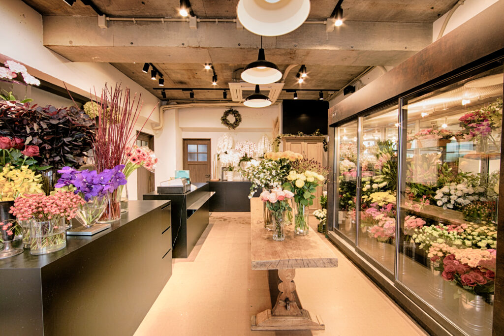 店内は天井の躯体を活かしたデザインとスポットライト、ペンダントライトを組み合わせ、花々の色彩がいっそう引き立ちます。