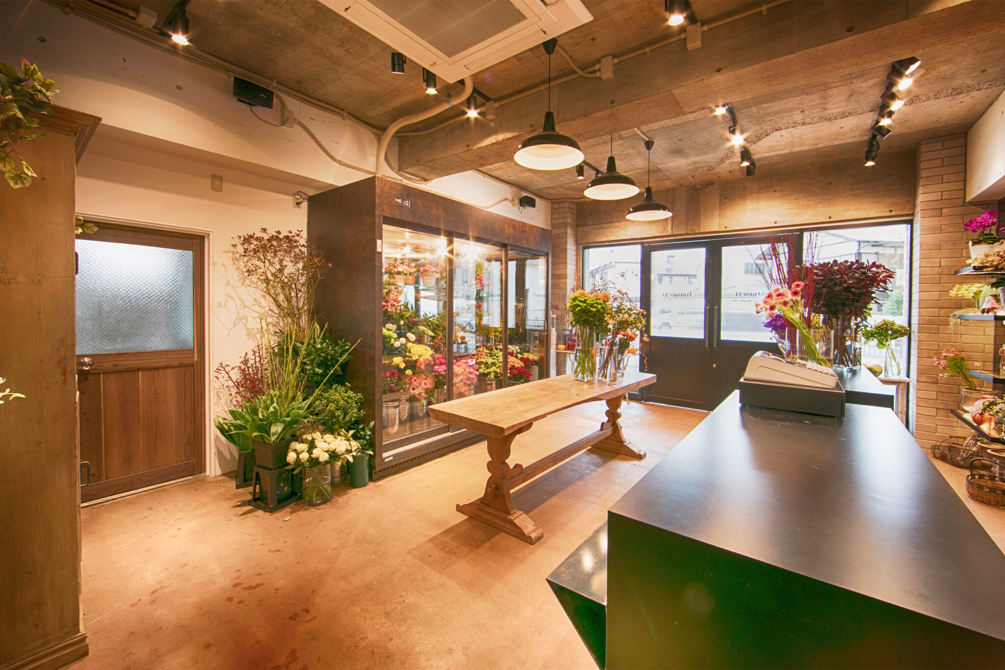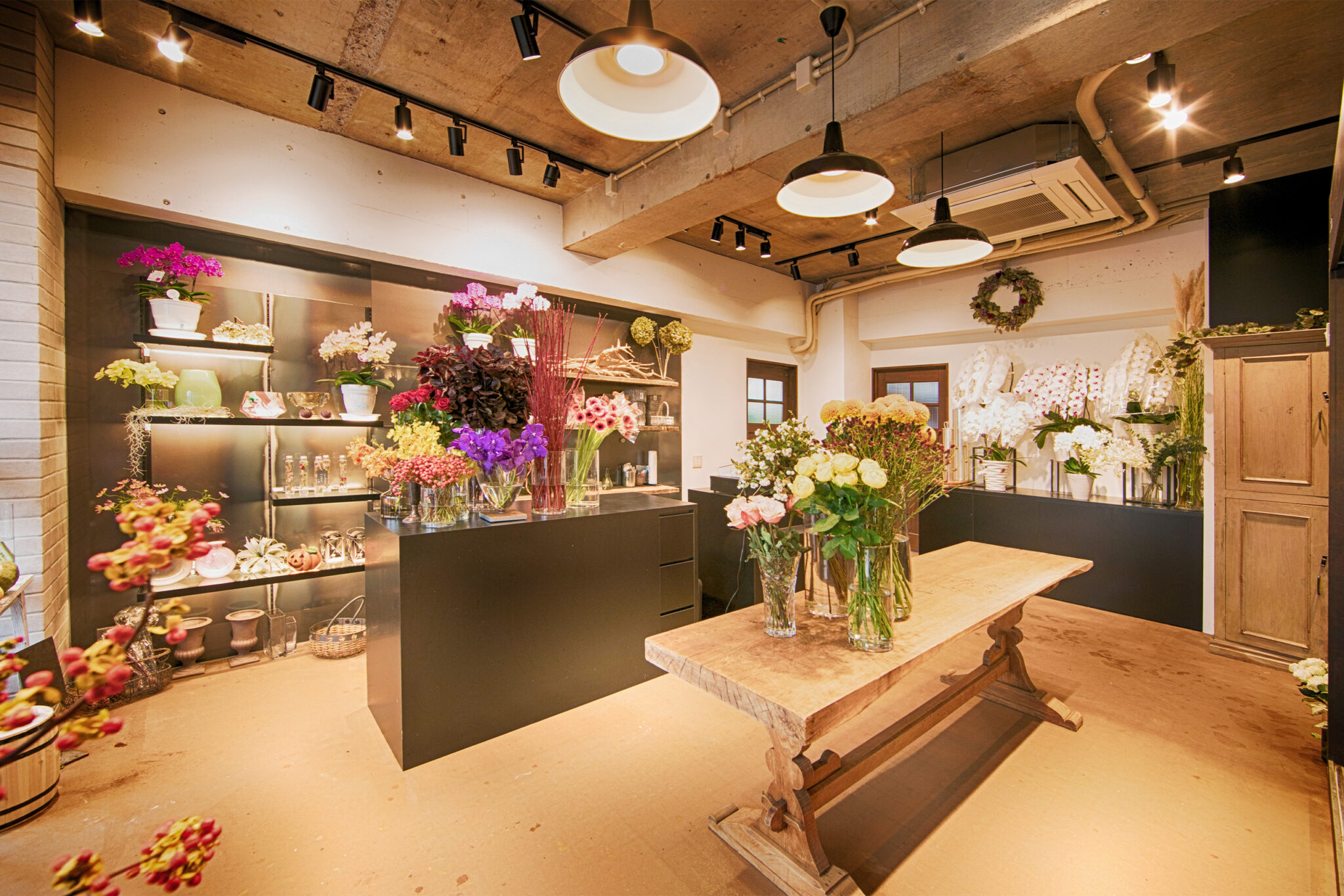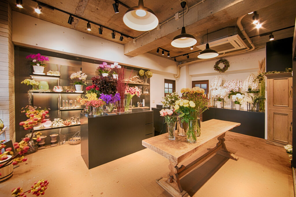 スポットライトやペンダントライトで花の色彩を映し出し、中央に木製テーブルを設けることで季節の花々を見やすくしていきます。