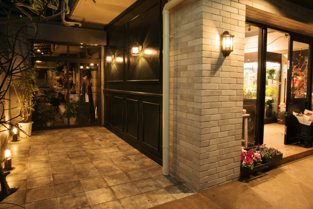 外観は落ち着きのある佇まいとやわらかな灯りで、お客様を温かく迎え入れ、店内は花々の彩りがより映える空間とし、季節ごとの魅力を心地よく楽しめるように。