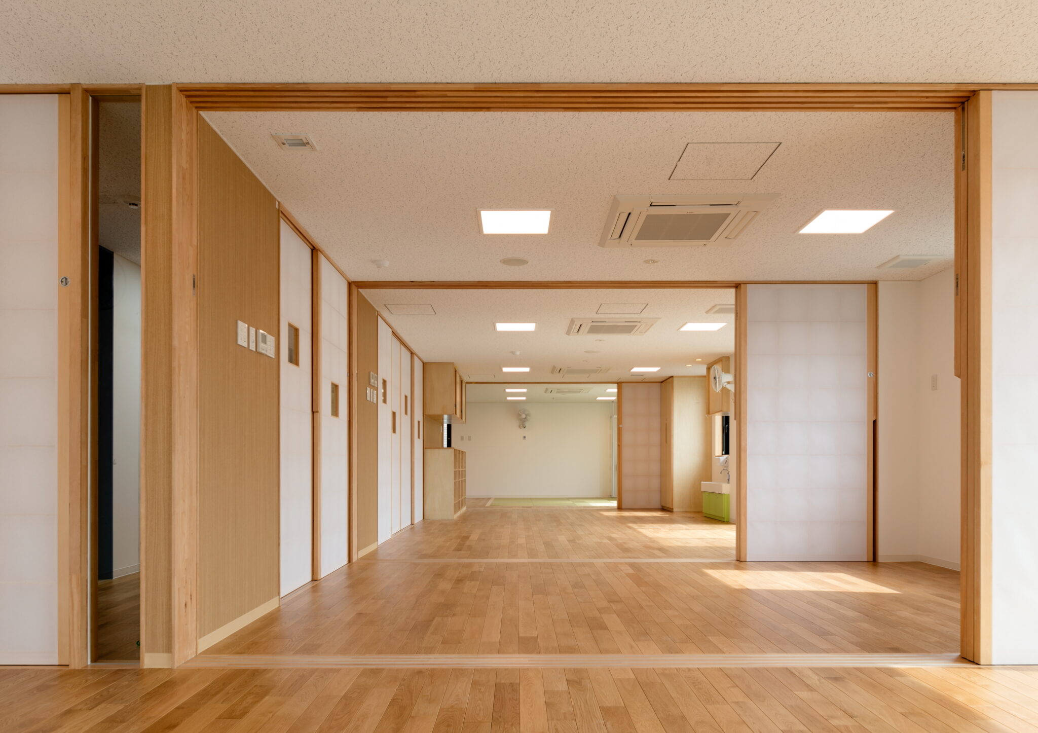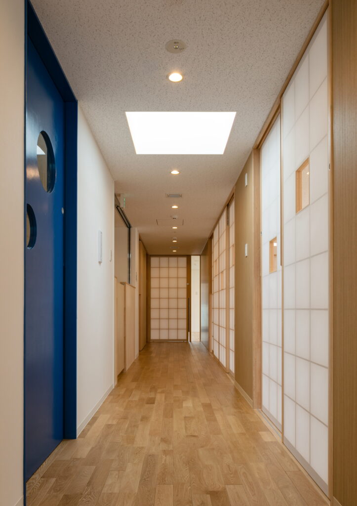廊下や保育室には障子風の建具を取り入れ、やわらかな光と落ち着きのある雰囲気に。