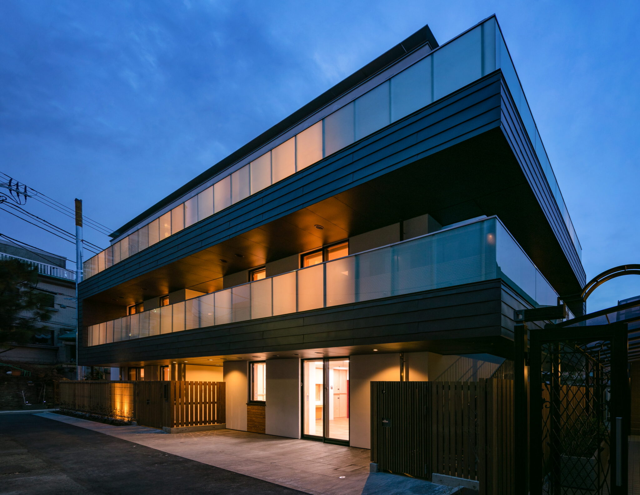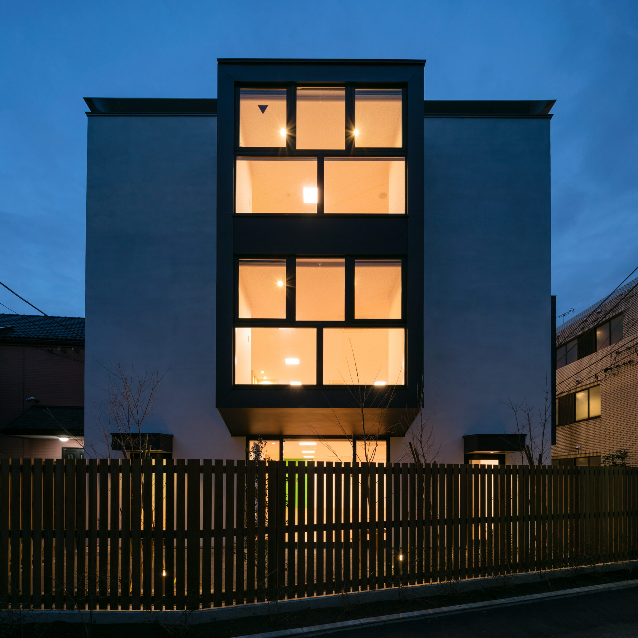 外観は、黒の外壁と温かな光の対比が際立ち、落ち着いた住宅街の中で安心感と存在感を感じられます。