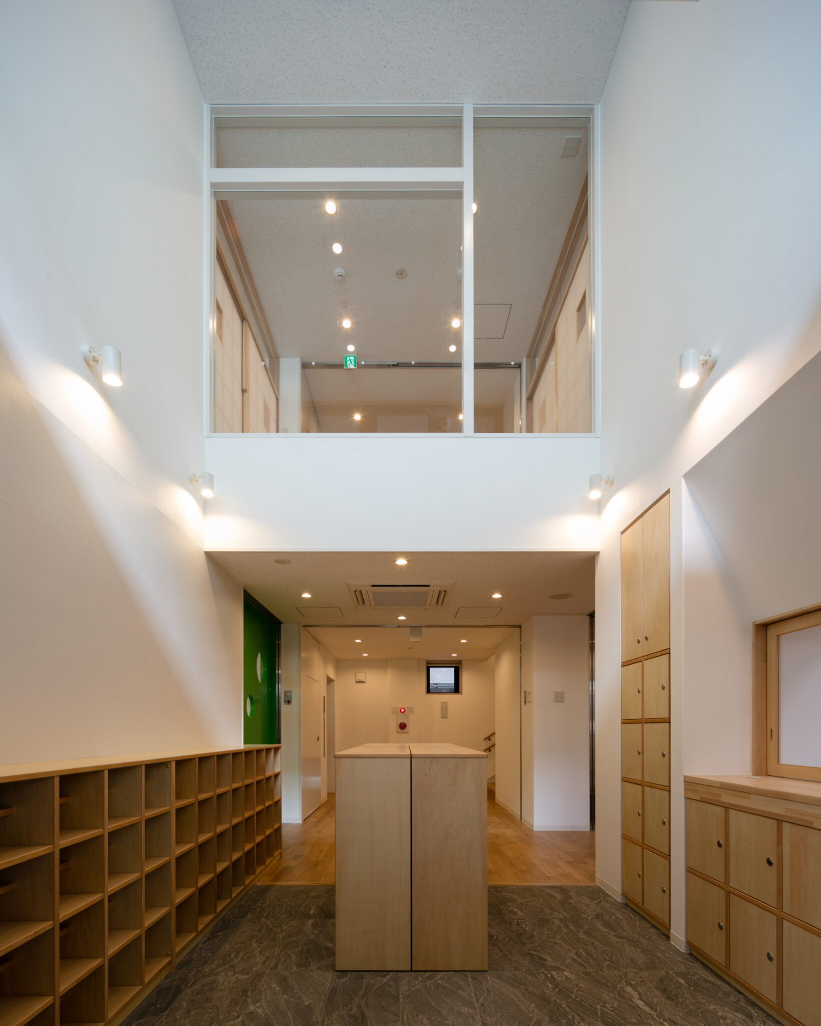 玄関から続く昇降口は、シンプルで整理しやすい収納を整え、子どもたちが自分で靴や持ち物を管理できるようになっています。