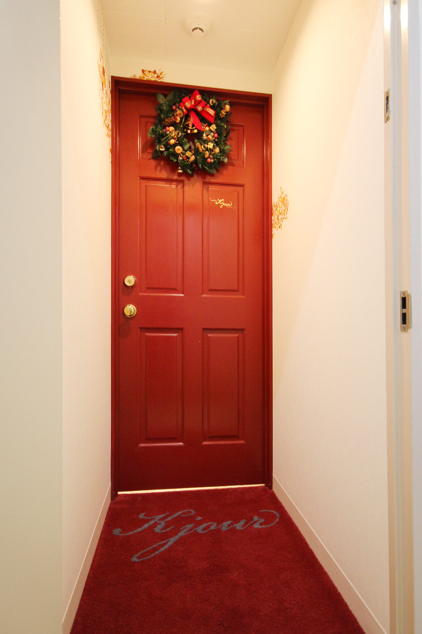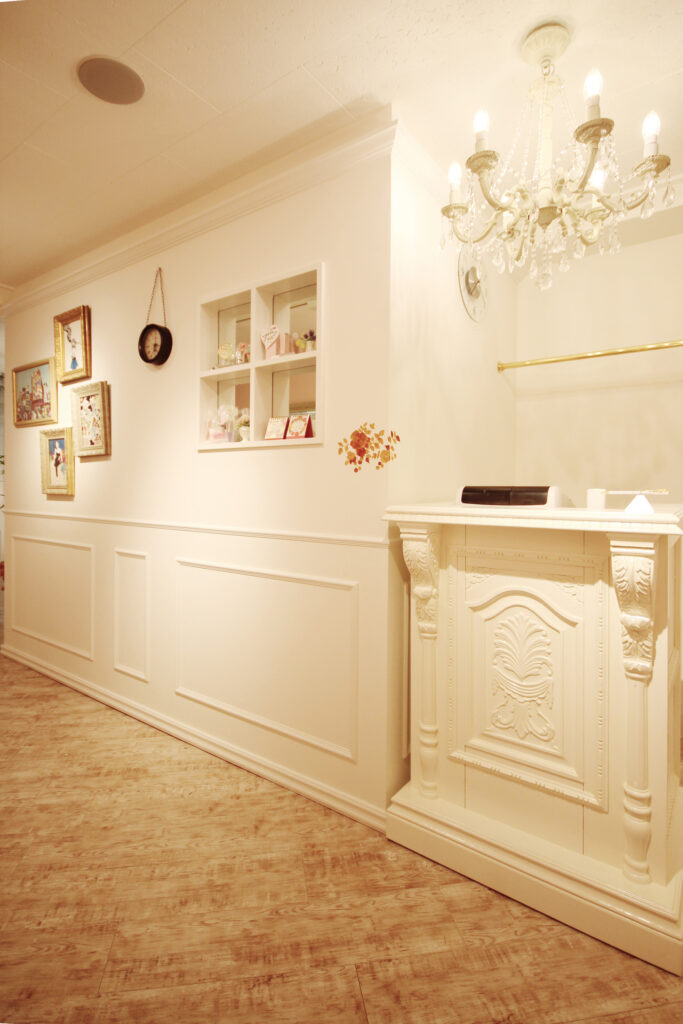 設計はIDEA DESIGN様による設計。白を基調とした空間にシャンデリアや装飾を合わせ、落ち着きと華やかさを兼ね備えた雰囲気を、設計通りに実現しました。アクセントとなる赤いドアが、隠れ家的な特別感と華やかさを添えています。