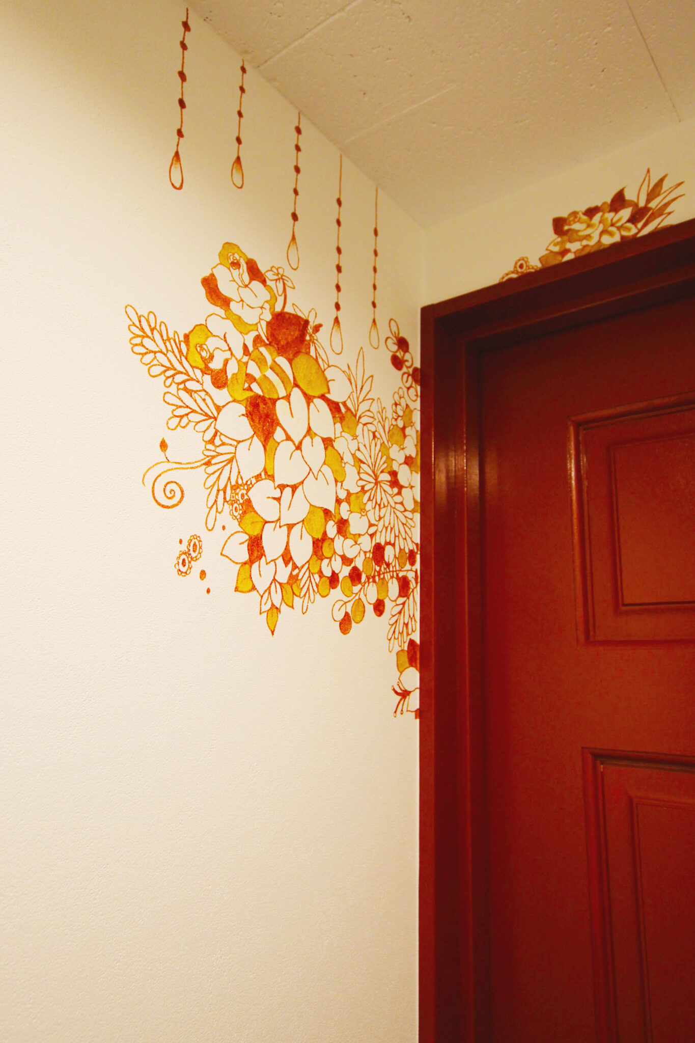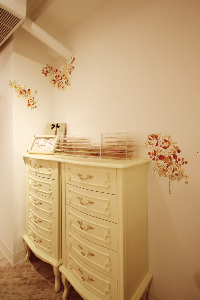 水まわりは可愛らしさと清潔感を重視。ドア付近の壁面の一部に、花柄の装飾やアートを施し、優雅さをプラス。特別感を感じられる、居心地の良いサロン空間となりました。