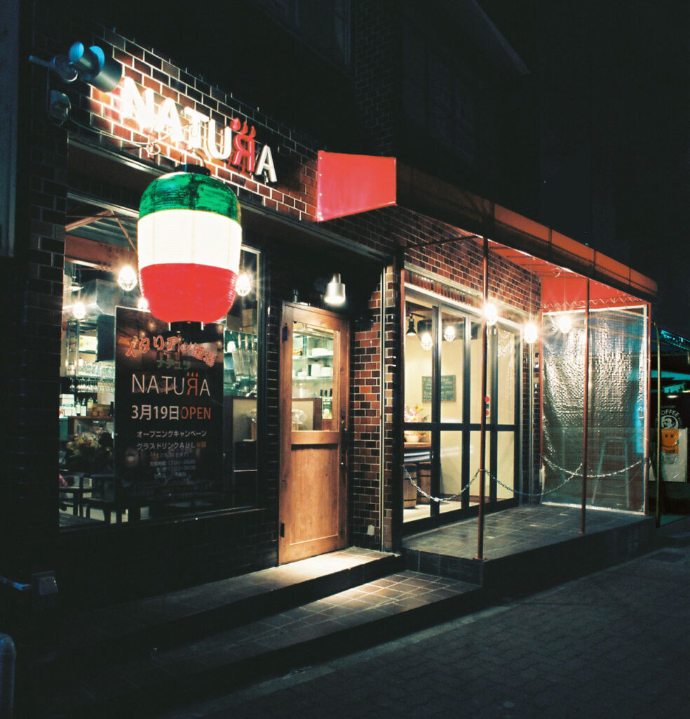 イタリアンバルでありながら、大衆酒場らしい親しみやすさを感じる外観は、昼は気軽に立ち寄れる明るさを、夜は灯りに照らされた賑わいを感じられます。